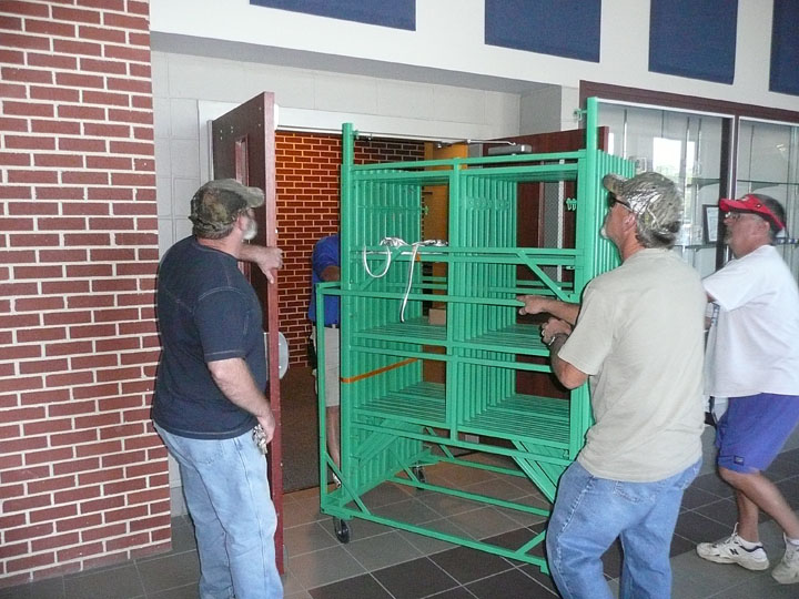 Workers brought the Light Bulb Scaffold™ System to the school in a utility trailer. The racks rolled through the front door and down to the front of the auditorium.