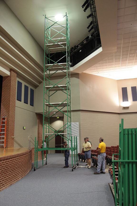 The first step was to change the three bulbs in front of the stage. The base unit was initially assembled high enough to clear the rows of seats when they changed the rest of the bulbs.